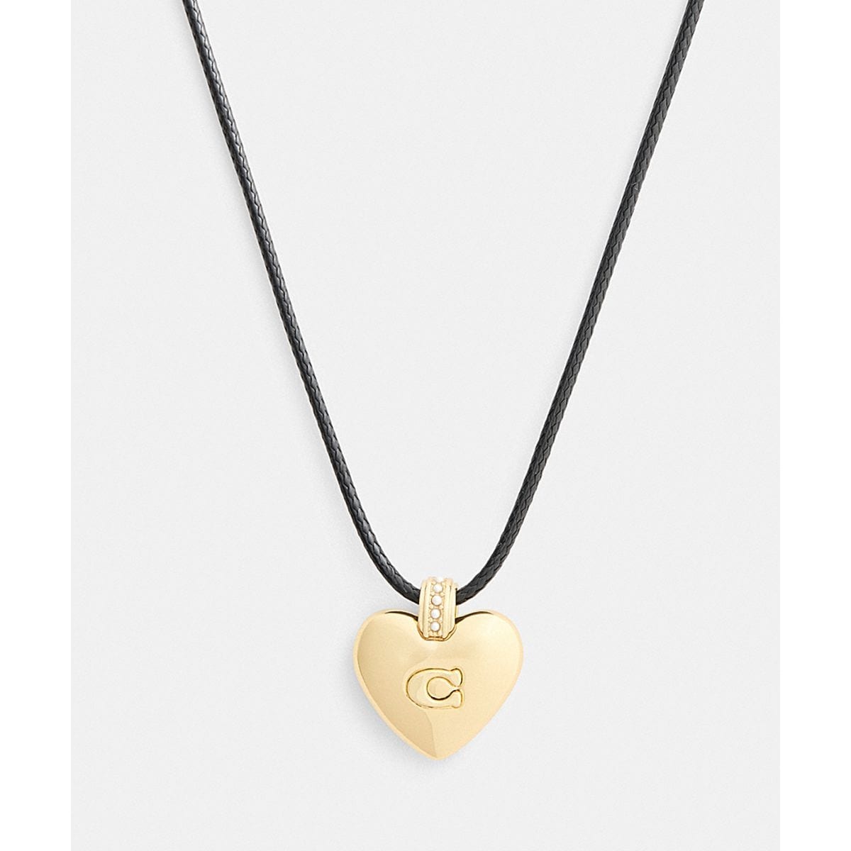 コーチの“C”をあしらったハートのチャームにクリスタルの煌めきを添えた、コード ネックレス。アジャスタブル クラスプで、ロングにもショートにも長さを調節できます。