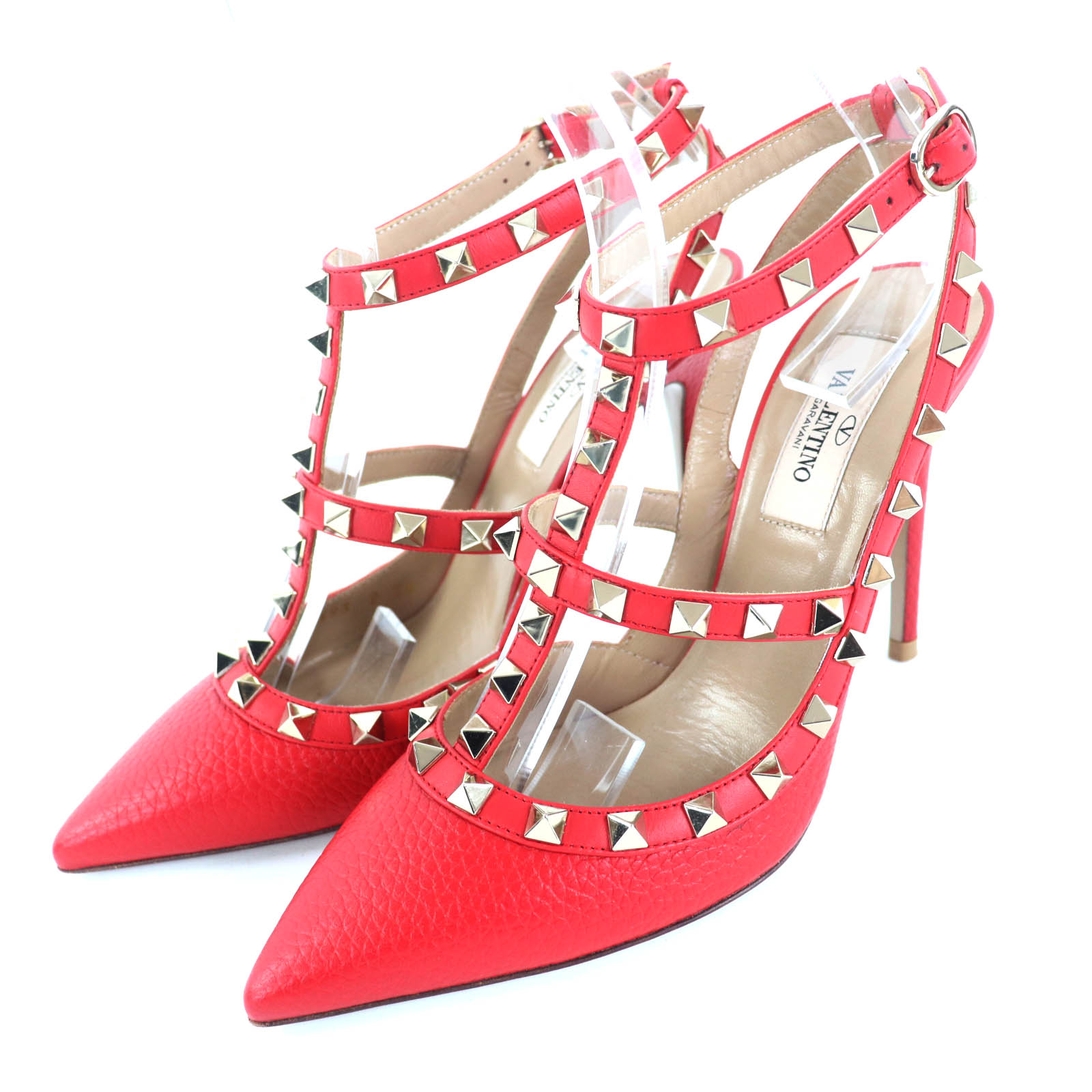 美品☆Valentino Garavani ヴァレンティノガラヴァーニ ロックスタッズ アンクルストラップ パンプス レザー ブーティ ブラック 35 イタリア製 レディース【中古】