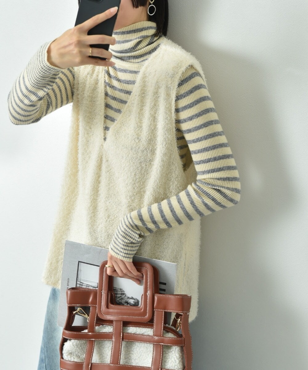 長い毛足が特徴のラメ入りフェザーヤーンを使用し、シンプルなコーディネートのアクセントにぴったりなアイテムです。シンプルにリブニットやカットソーを合わせたり、ワンピースの上からレイヤードするスタイルもお勧め。