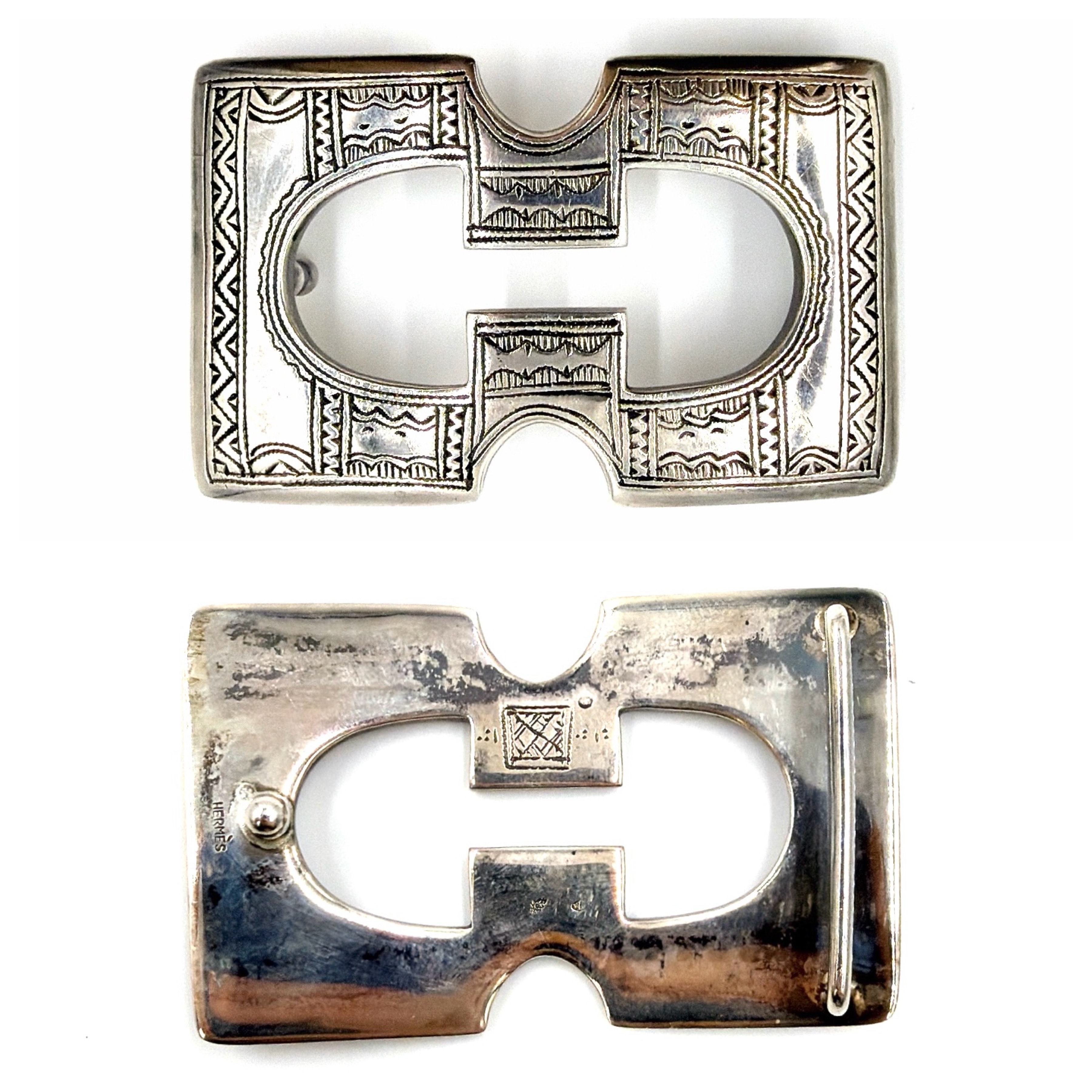 伝統的なトゥアレグ民族のモチーフを彫金で表現したバックルが特徴で、繊細かつ力強いデザインが高級感を引き立てます。