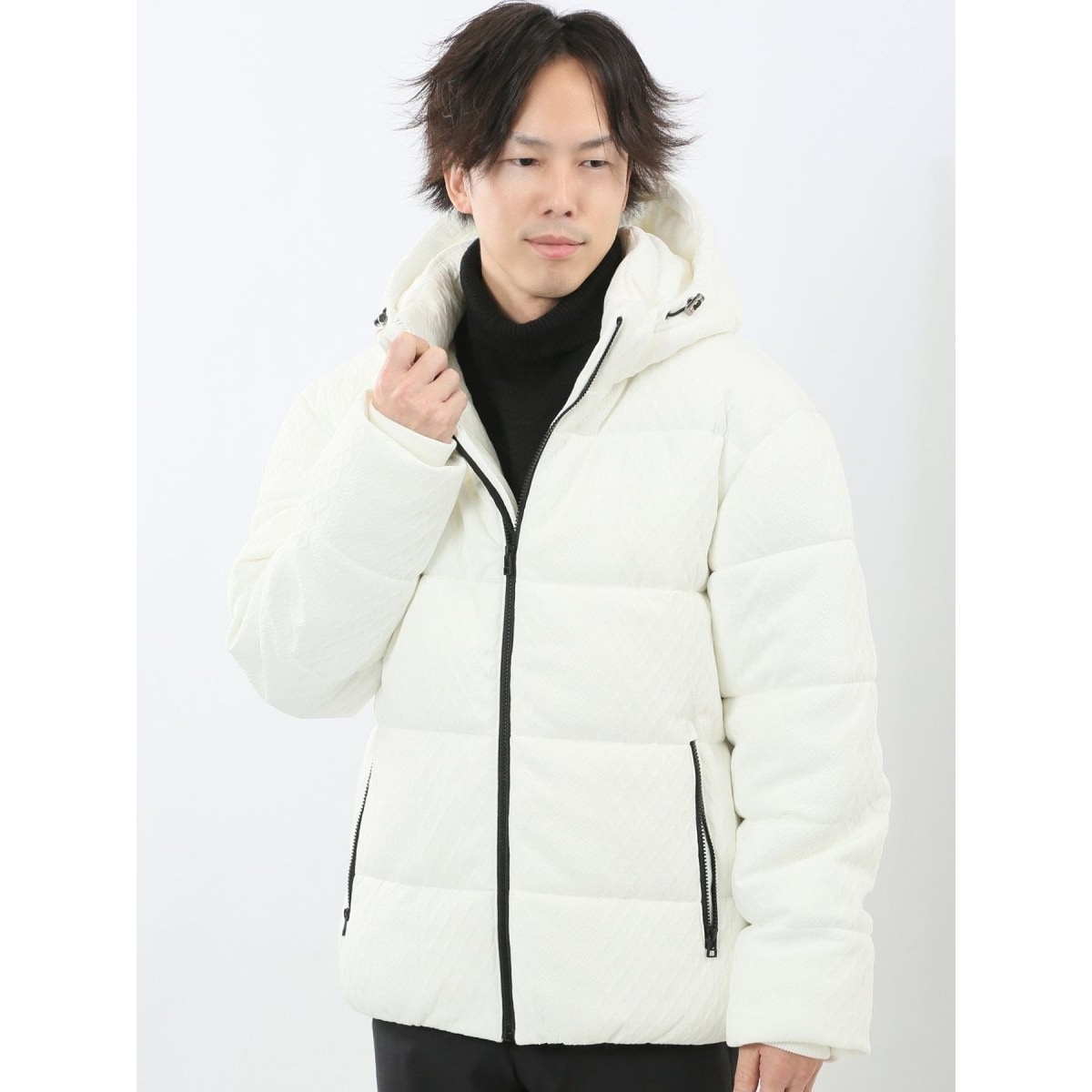 表面感のあるジャガード柄が存在感を発揮する、中綿入りのフーデッドブルゾンです。取り外し可能なフード、フード部分のドローコード、着脱がスムーズなフルジップ仕様、手の入れやすいファスナーポケット、風の侵入を防ぐ袖口のリブニット、裾部分のシャーリングがポイントになっています。