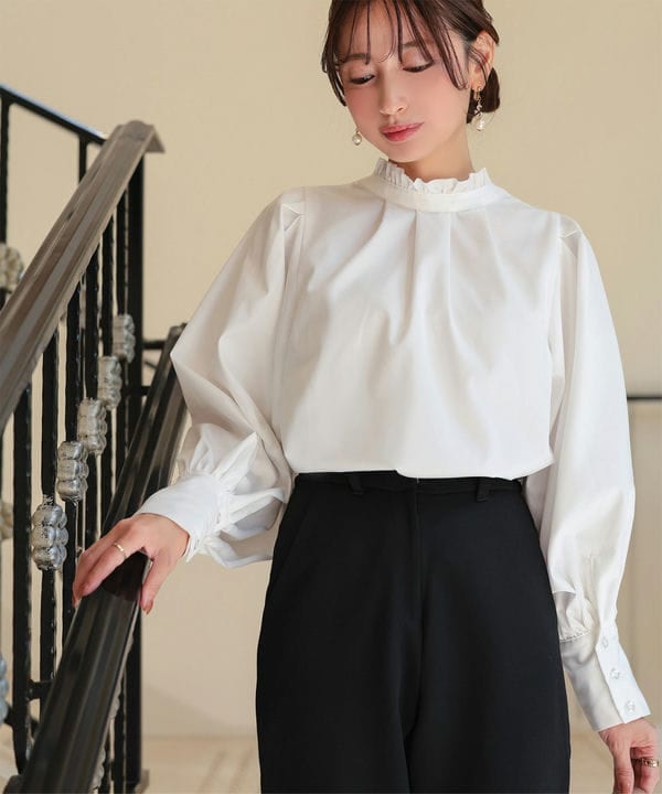 綿・コットン素材 / ポリエステル素材 / 無地 / フリル / 長袖 / その他袖デザイン / ライフスタイル / スタンドカラー / ハイネック・タートルネック / パーティー・結婚式・二次会 / セレモニー・入学式・卒業式 / レギュラー丈(トップス)