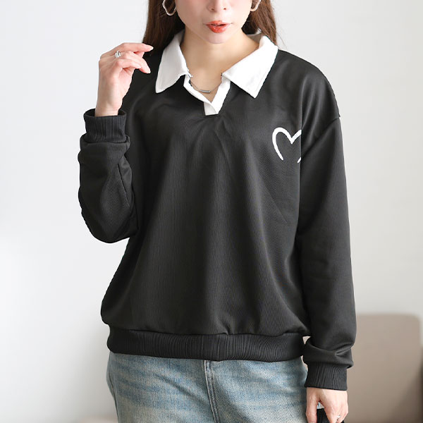 襟付き&キーネック風の抜け感のネックがポイントのスウェットプルオーバー。程よいゆったり感が全体の印象を自然に整えてくれます。リブ仕立ての袖口と裾は、だぼっとしたシルエットを回避してメリハリを作ります。また、着脱による伸びや型崩れを防ぎ、長く愛用できるスグレモノ。胸にはハートのロゴがあり、女の子らしい可愛いアクセント。デイリー使いにぴったりのイージーケア素材で気軽に着れるのも◎カジュアルコーデ、リラックスウェアなど幅広く活躍してくれる一枚です。