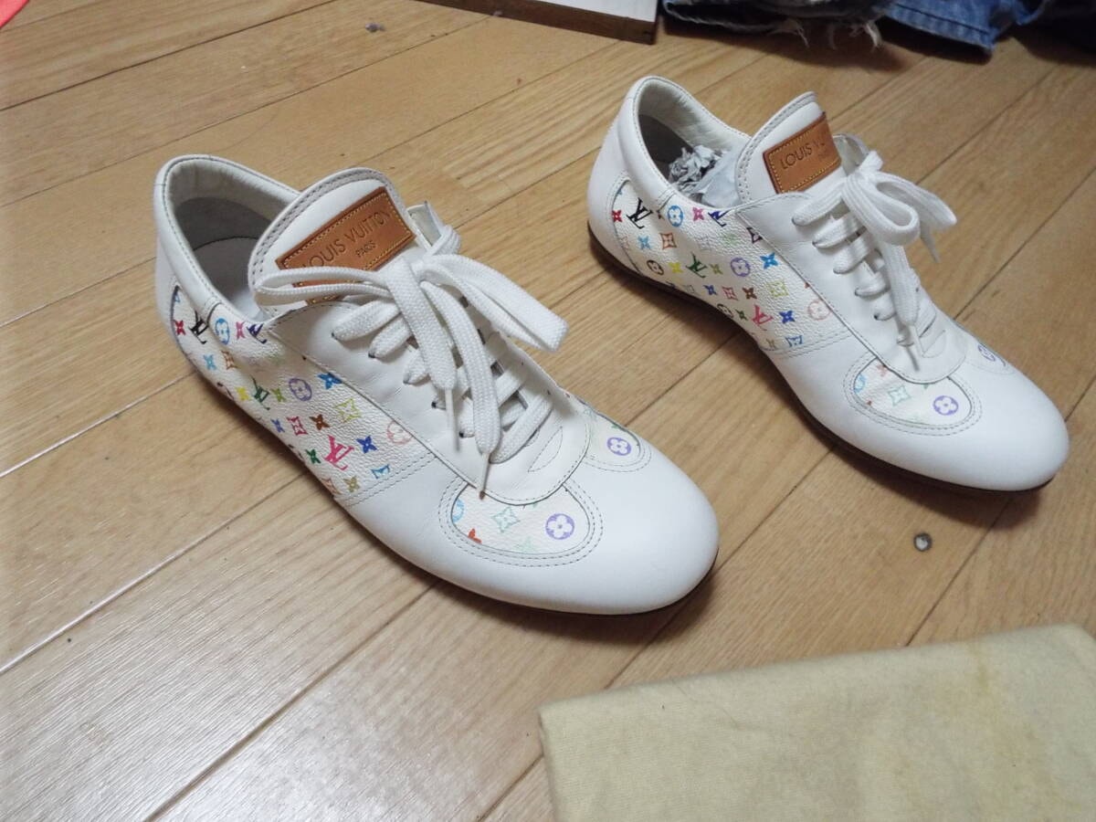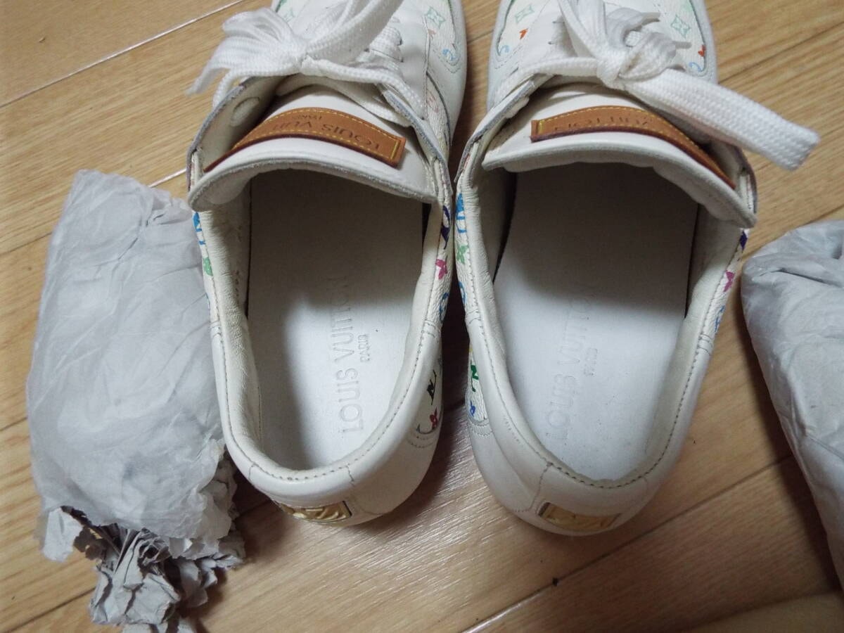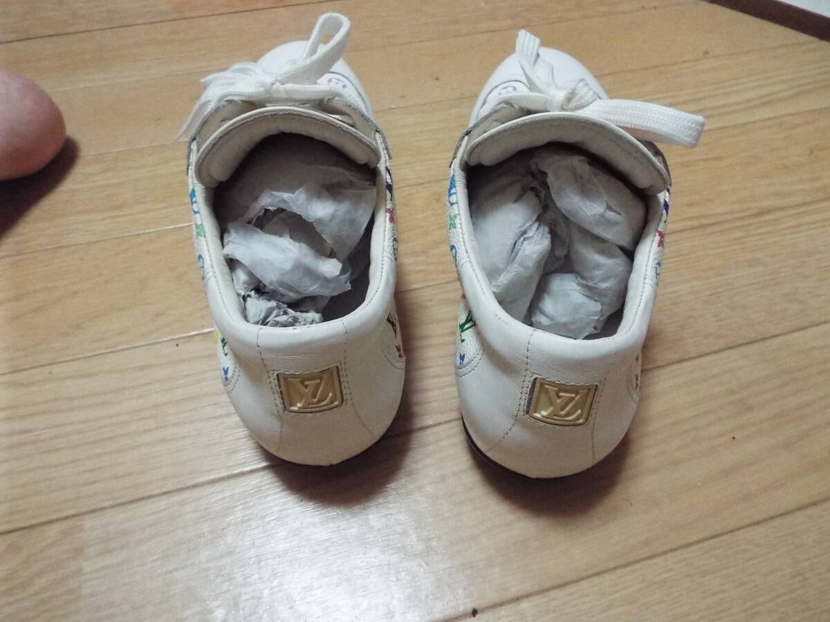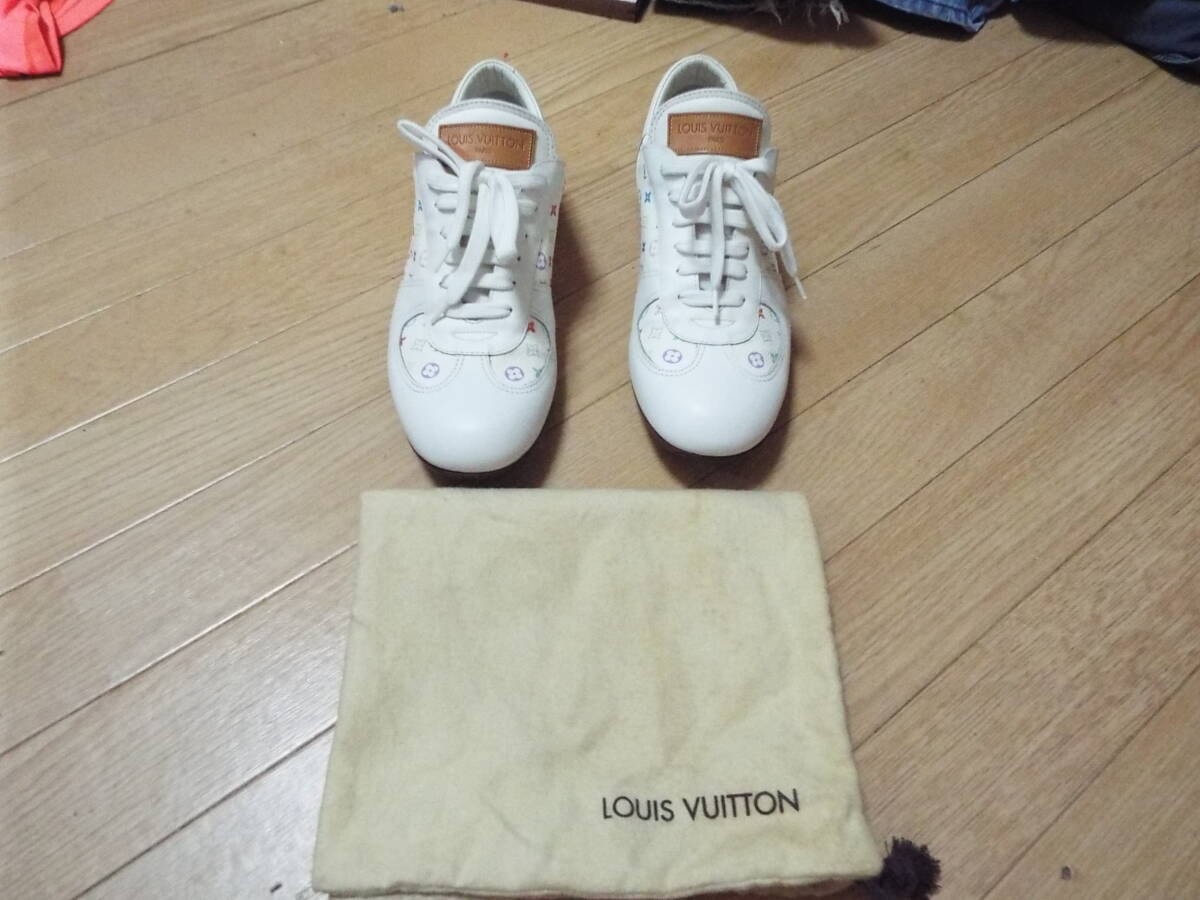 紐は部屋に置きっぱなしの保管の為、薄っすらホコリ被りがあります。オブジェ感覚で飾っていて履く機会もなく年齢的にも似合わない年代の為に出品しました。どなたか興味あればご検討ください。ヴィトン純正の布袋もあります。