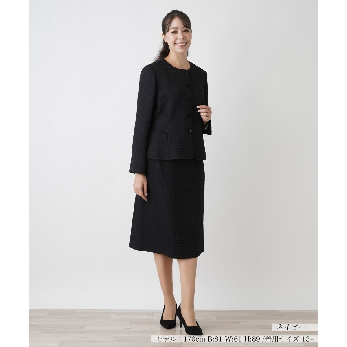 品の良い光沢感のあるフクレジャカードのスーツです。特殊加工を施したトリアセテートとポリエステルを使用し、生地に程よい膨らみと柔らかな風合いが出るように仕上げています。ジャケットはタテの切り替えが女性らしいシルエット。飽きの来ないベーシックな正統派スーツです。