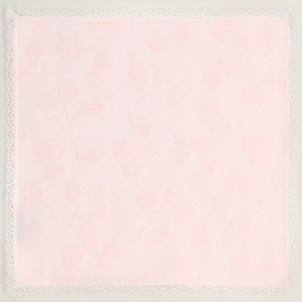さくらんぼモチーフのニットパイルハンカチ。ヘムのレースが華やかで、プレゼントにもぴったりです。