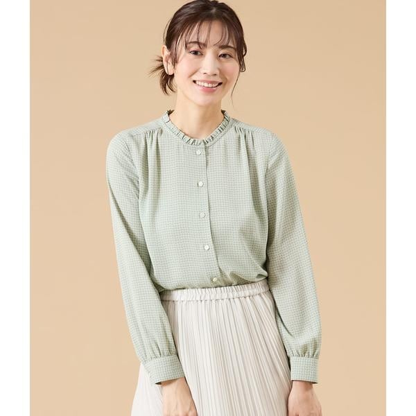 軽やかなジオメトリック柄が上品に映える、着映えブラウス。1枚着にはもちろん、ジャケットのインナーとしても優しい華やかさをプラスしてくれます。学校行事・食事会・顔合わせなど、好印象に決めたいオケージョンシーンにも頼れる1着です。入学・卒業などのセレモニーでもほど良い華やぎを与え写真映えのするライトグリーン、オフィスや学校行事でも好印象を与える間違いのないネイビーの2色展開。