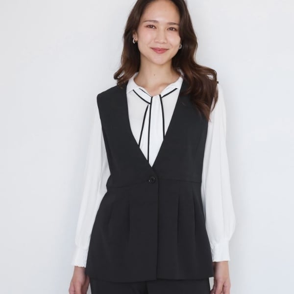 脇パネルで立体感を出し、ウエストから裾にかけてタックを入れた華やかで女性らしいシルエットのジレに仕上げました。