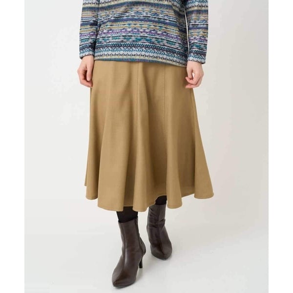 裾に向かってきれいに広がるフレアシルエットは上品な一枚。合わせるトップス次第できれいめにもカジュアルにもマッチする着回し力の高い一枚です。すっきりとしたフロントなのでインスタイルも決まります。後ろウエストはゴム仕様なので着脱もしやすいです。