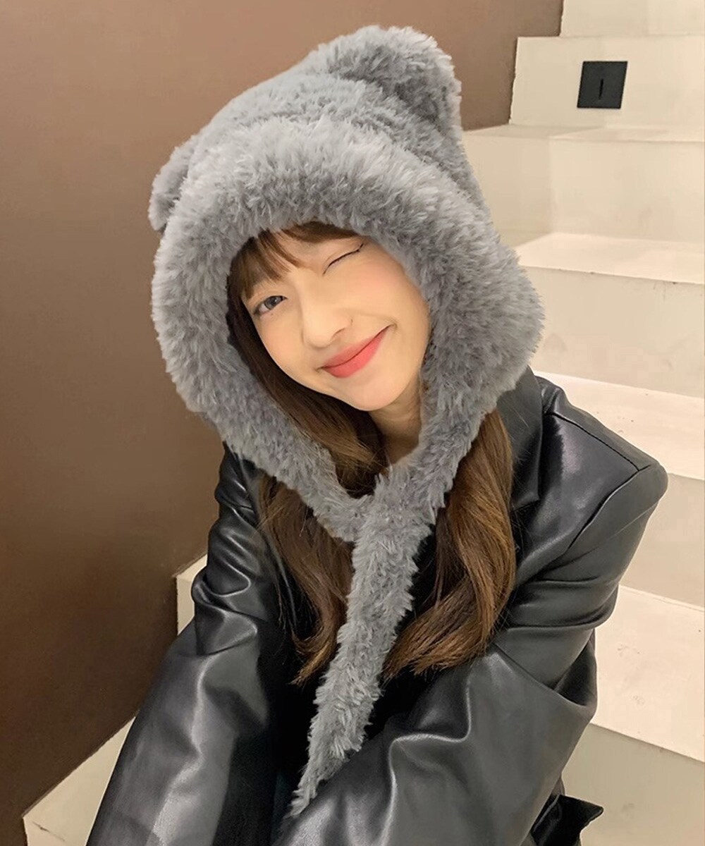 もこもこの毛並みが顔まわりに柔らかいニュアンスを添え、被るだけで季節感のある可愛いスタイリングに。