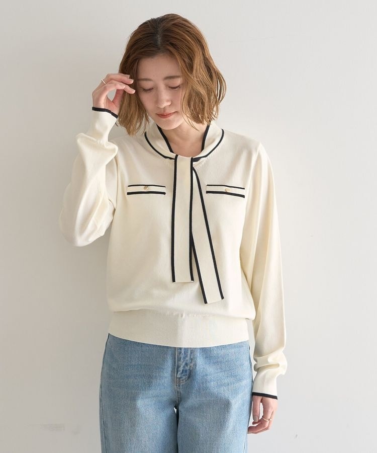 Vネックにはボウタイリボンを施しフェミニンなアクセントをプラス。