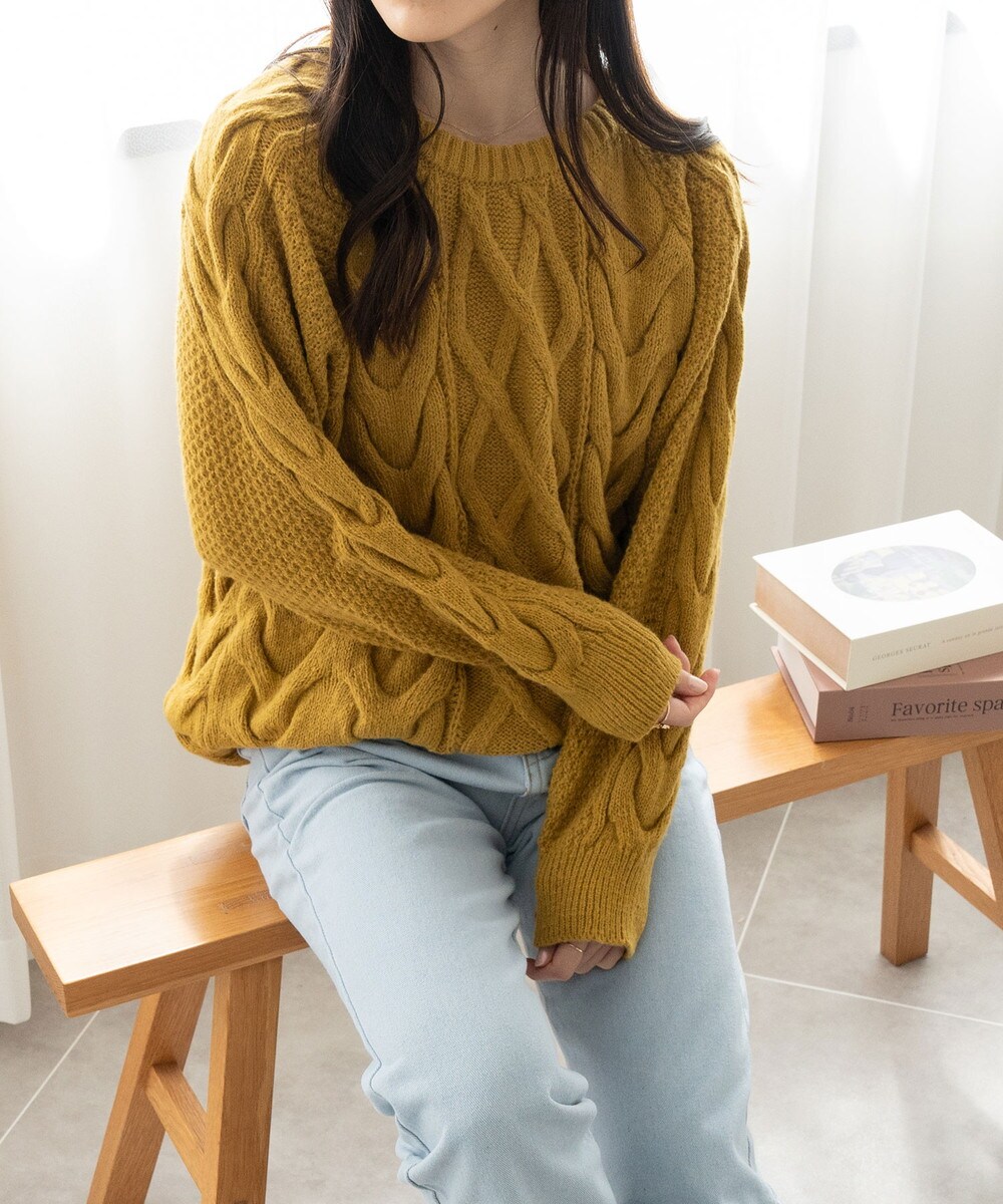 肌触りの良いニット素材にマルチケーブル編み仕様、