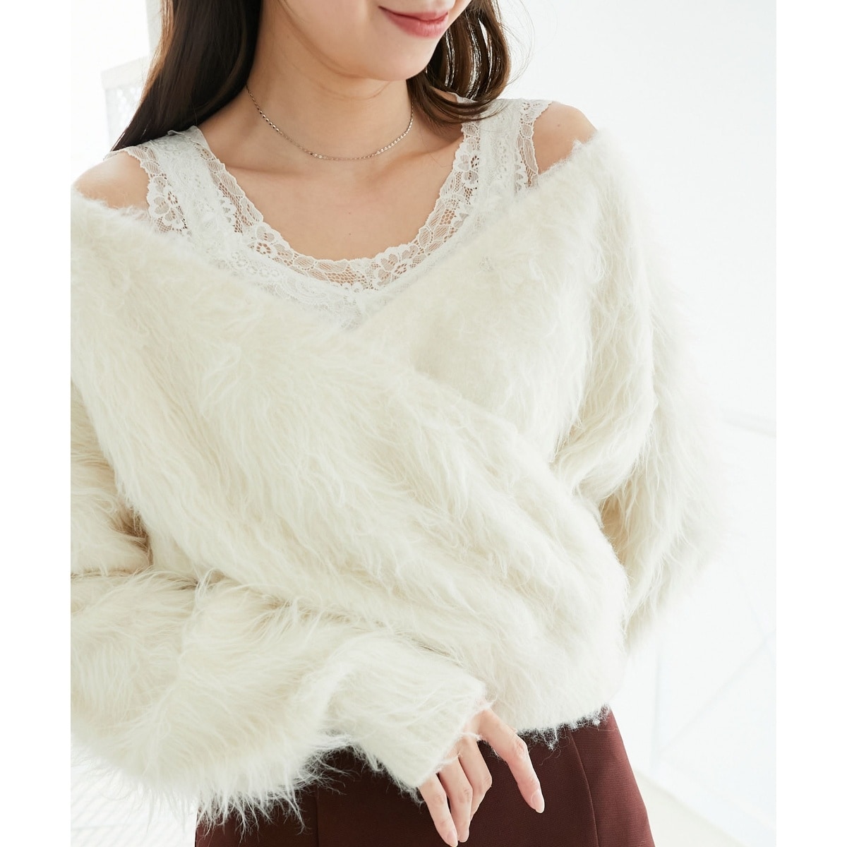 ふわふわの糸を起毛させて、風合いよくやわらかに仕上げたカシュクールニット。