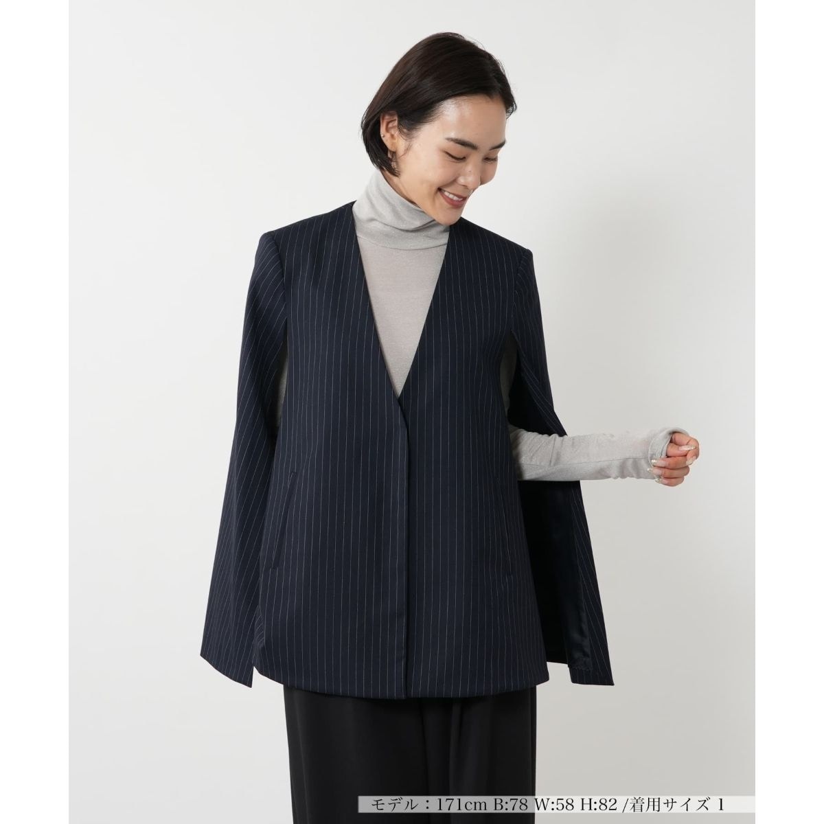 羽織るだけでドラマティックな着こなしが完成する、主役級のケープジャケット。クラシカルなジャケットを、現代的なケープシルエットで再構築。肩から流れるラインが上半身を華奢に見せ、二の腕やウエスト周りをナチュラルにカバーします。さらに動くたびに生まれる優雅なドレープが、マニッシュなピンストライプに女性らしさをプラス。表地は伸縮性があり、肩周りも窮屈感なく快適な着心地を実現しました。シンプルなニットやワンピースに重ねるだけで旬のスタイルが完成します。