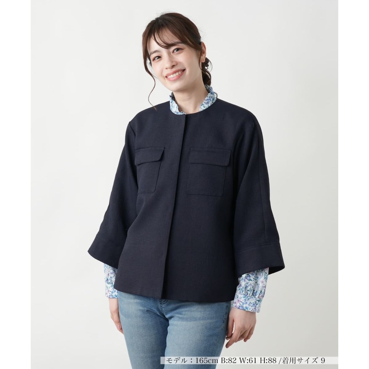 中空糸と呼ばれる筒状の形状をした糸を使用したノーカラージャケット。糸の中心部が空洞になっているため、見た目よりも軽くソフトな風合いに仕上がってします。さらに、もみ加工を加えナチュラルな風合いを表現しています。胸元のパッチポケットがデザインポイントです。七分袖なので初夏までお召しいただけます。初秋の羽織りジャケットとしてもおすすめ。