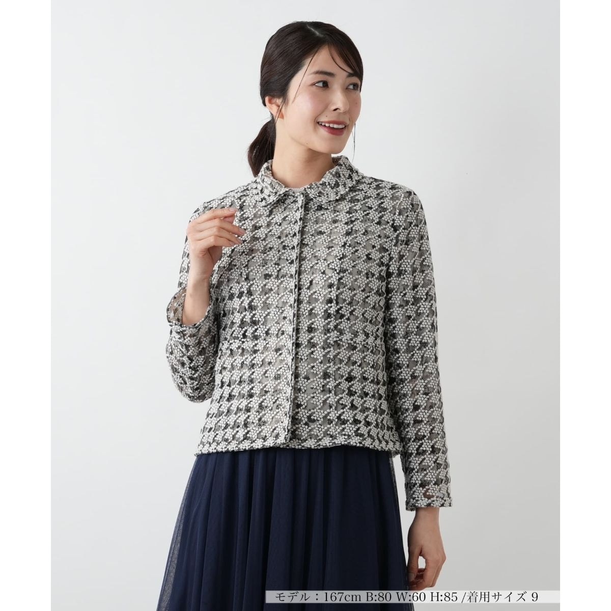シアー素材に千鳥格子柄を立体的に表現した、エレガントな襟付きジャケット。クラシックなパターンと軽やかな透け感が絶妙にマッチ。フロントは比翼仕立てで、スナップボタンによりスムーズな着脱が可能。コンパクトなフォルムですっきりとしたシルエットをキープ。さりげなくウエストラインを引き締め、メリハリの効いた着こなしを叶えます。ロングスカートやワンピースと合わせればスタイルアップ見せ効果も期待でき、パンツでまとめればシックで都会的なコーディネートが完成します。