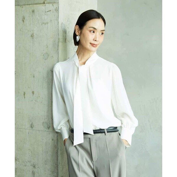 ストレッチジョーゼットで仕立てたシアーボウタイブラウス。ノーカラージャケットのインナーとしても映えるすっきりとしたシルエットに、顔まわりを華やかに引き立てるボウタイのデザインを添えました。オフィススタイルに、洗練された印象をプラスする一枚です。