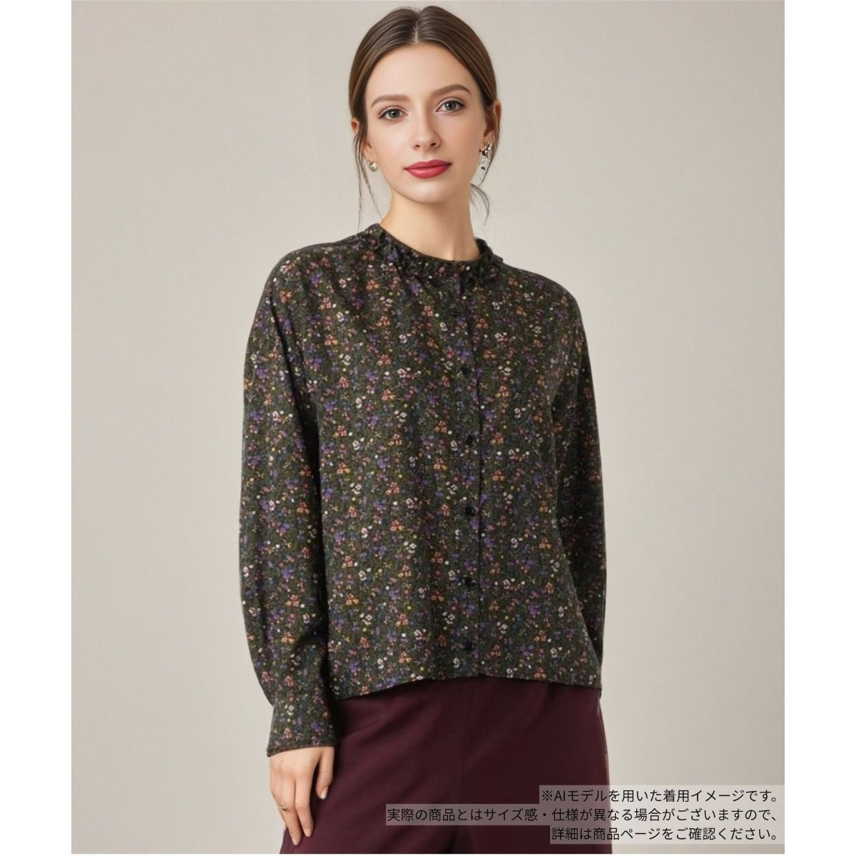 襟元のさりげないフリルが顔周りを華やかに彩る、クラシカルな小花柄のブラウス。甘すぎないデザインで大人の女性にぴったりのアイテムです。一枚で着こなすのはもちろん、ニットやスウェットの首元からフリルを覗かせるレイヤードスタイルも今シーズンらしくておすすめ。軽やかな素材感なので優しげなニュアンスに仕上がります。シーンを選ばずロングシーズン着回せるのも嬉しいポイントです。