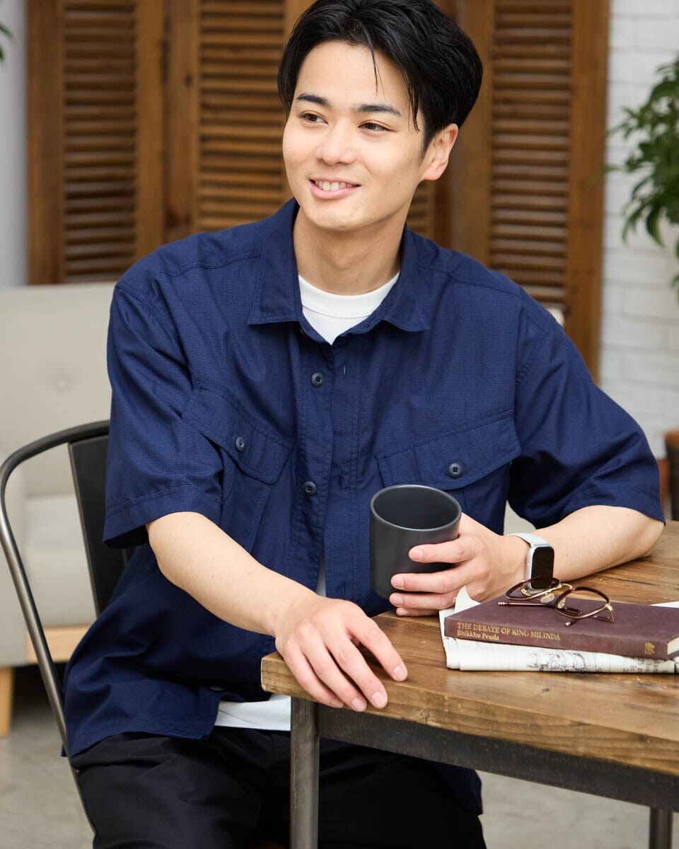 半袖バンドカラーストライプオーバーシャツ