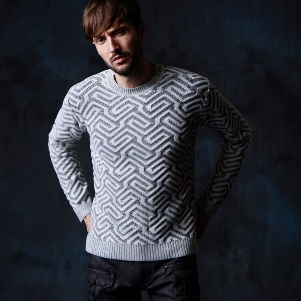 身頃部分の大き目な幾何学柄がインパクトのあるクルーネックニット。