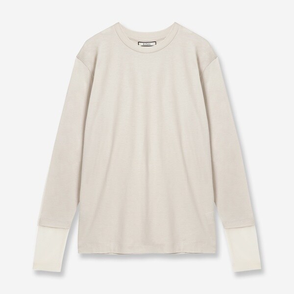 60/2ギザリヨセル天竺素材。油脂分を多く含み、独特の滑らかな質感を持ったギザを使用。しなやかでソフトな風合いや、上品な光沢感が特徴です。 別布(シアー)部分:世の中で最もハイゲージな天竺組織で編みおろし、独自のタンブラー加工で生地に膨らみと上品さを与えました。繊細で力強い、新しいジャージ生地に仕上げています。