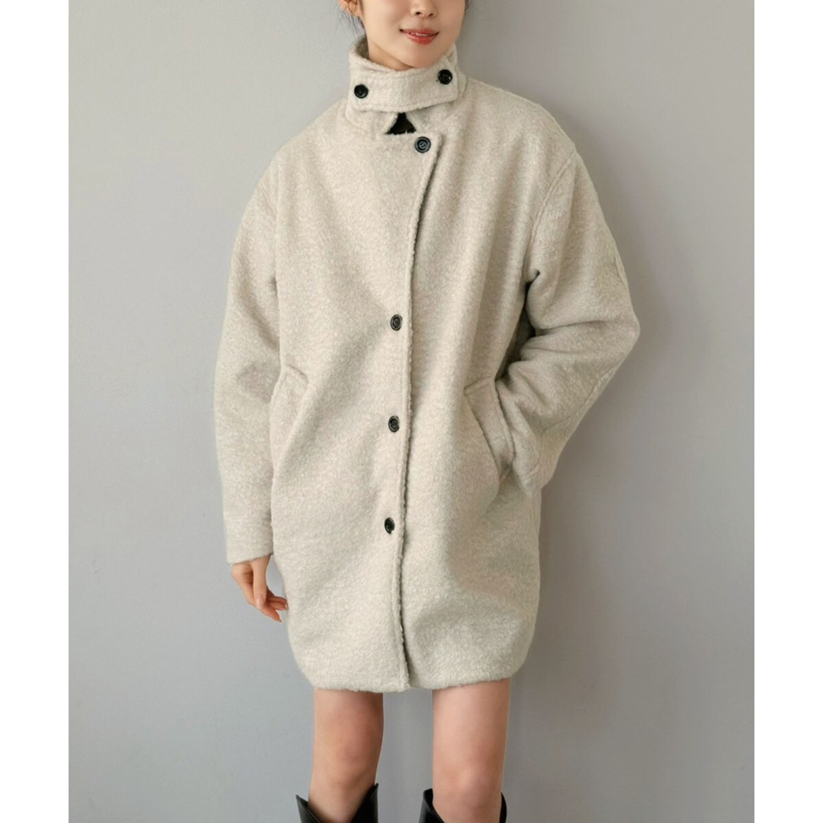 やわらかなシャギー生地を使用したミディアム丈コート。