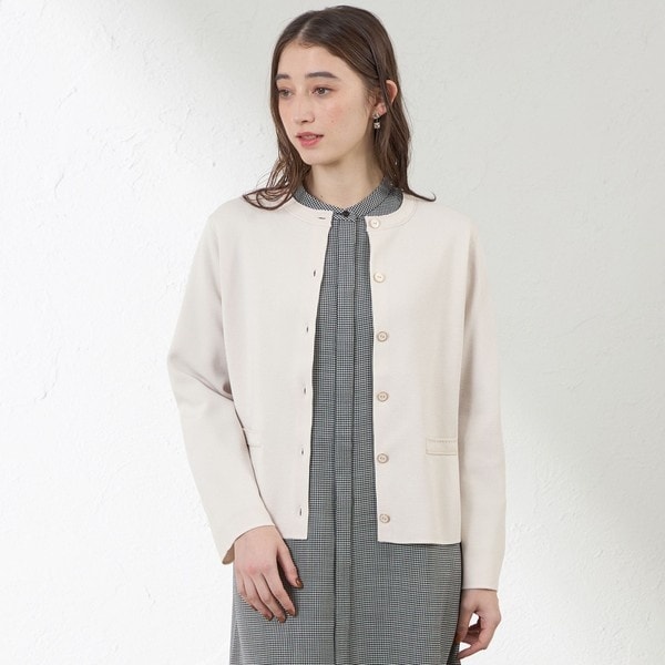 バストダーツを入れ、立体感のあるパターンで編み立てた、光電子を交編したミラノリブのニットジャケットです。
