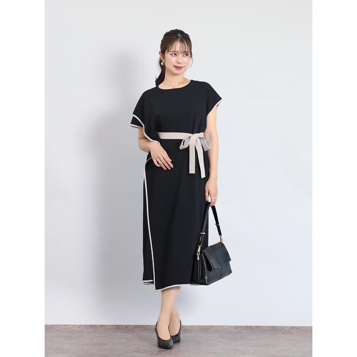 ウエストには配色リボンを通してウエストマークが可能で、女性らしいシルエットを強調し、コーディネートに華やかさをプラス。