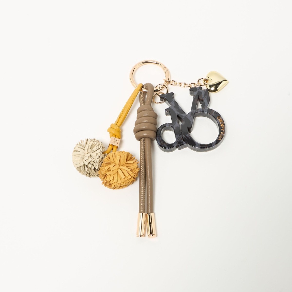 ポンポンモチーフやレザー調コード、小ぶりなハートチャームを組み合わせた存在感のあるルックスで、いつものバッグにアクセントをプラスします。