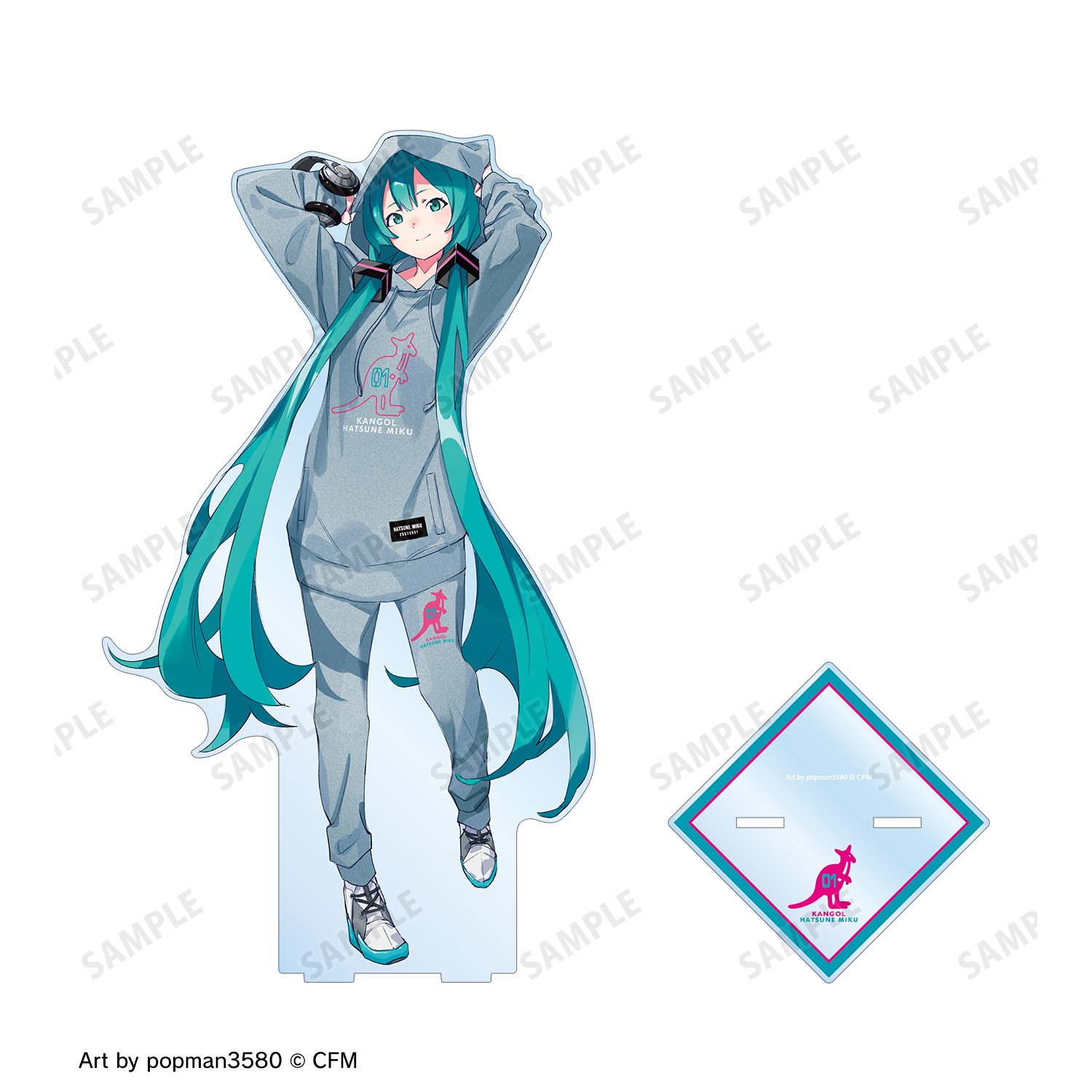 popman3580さん描き下ろしイラストの初⾳ミク、「KANGOL®」とのコラボレーションロゴを使⽤してデザインした、特⼤サイズのアクリルスタンドに仕上げました。