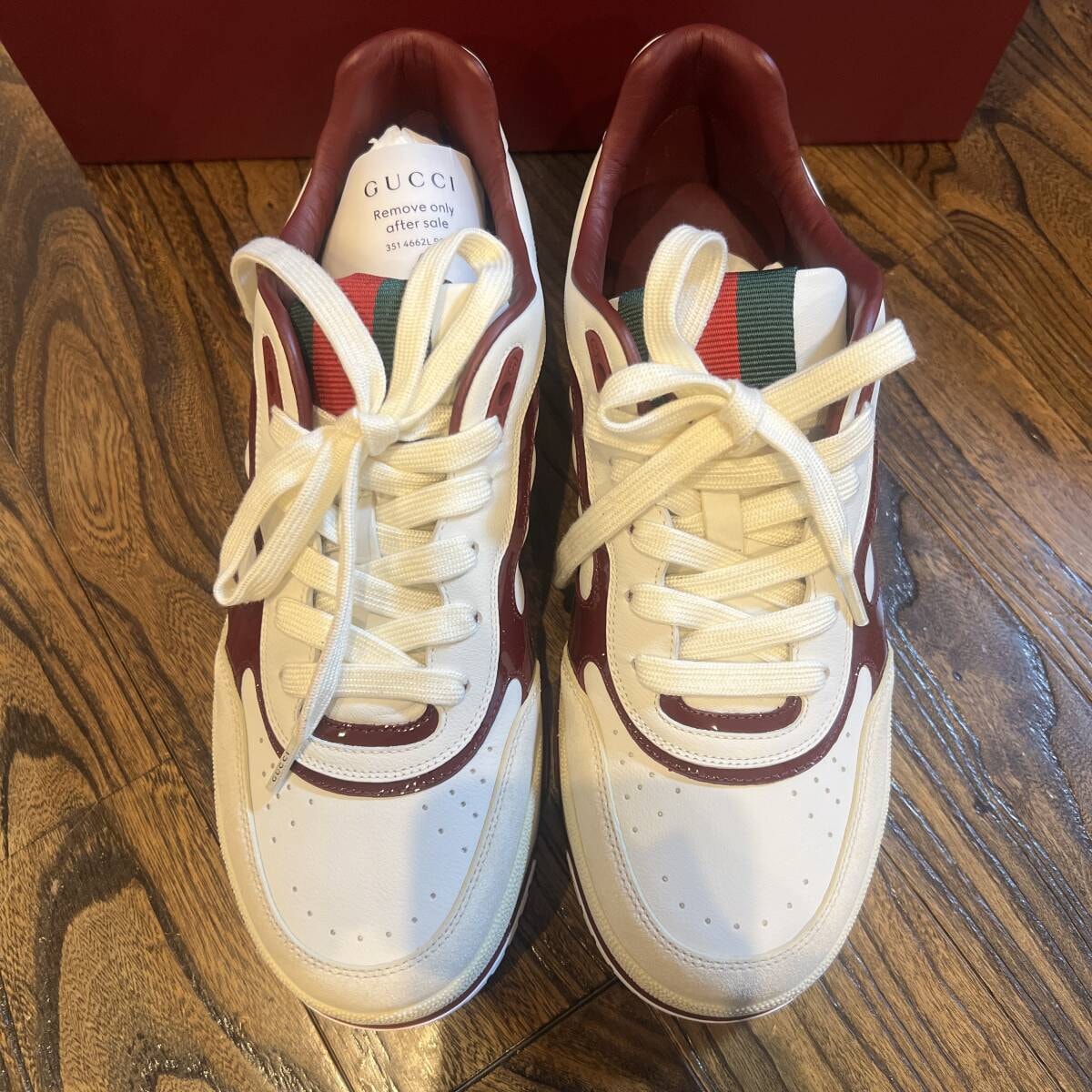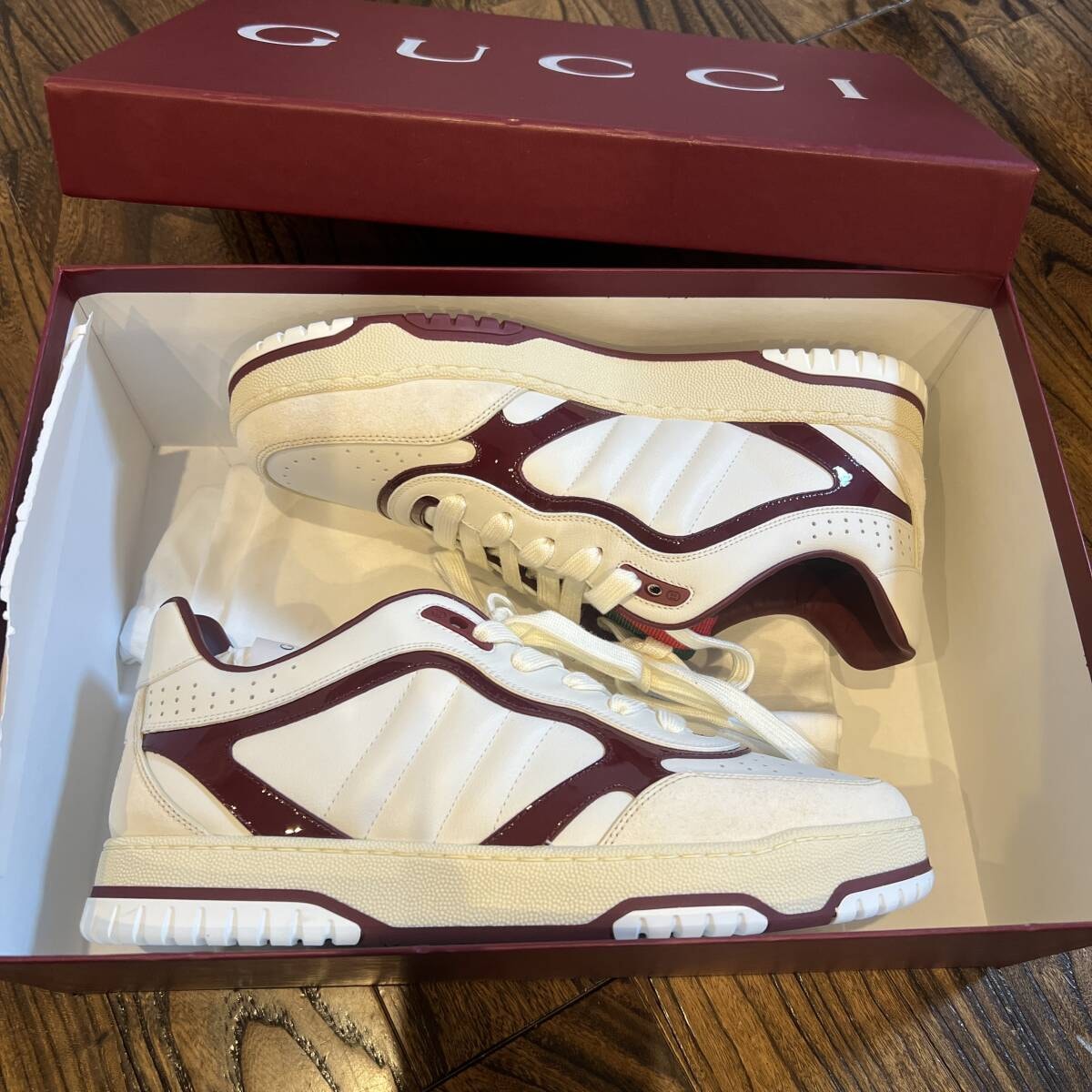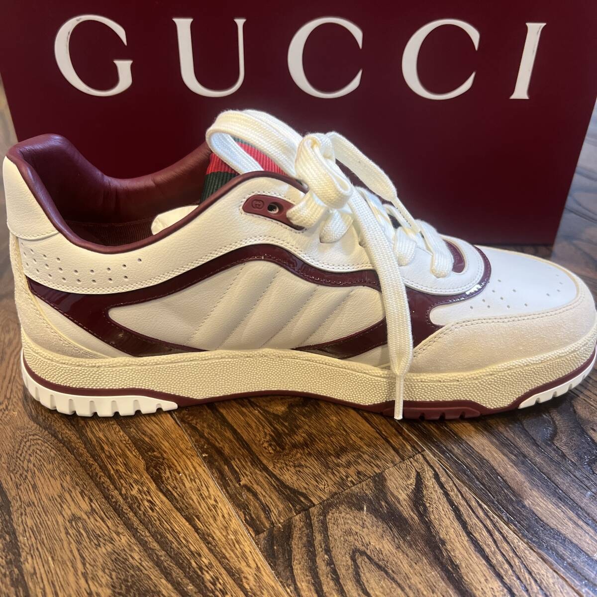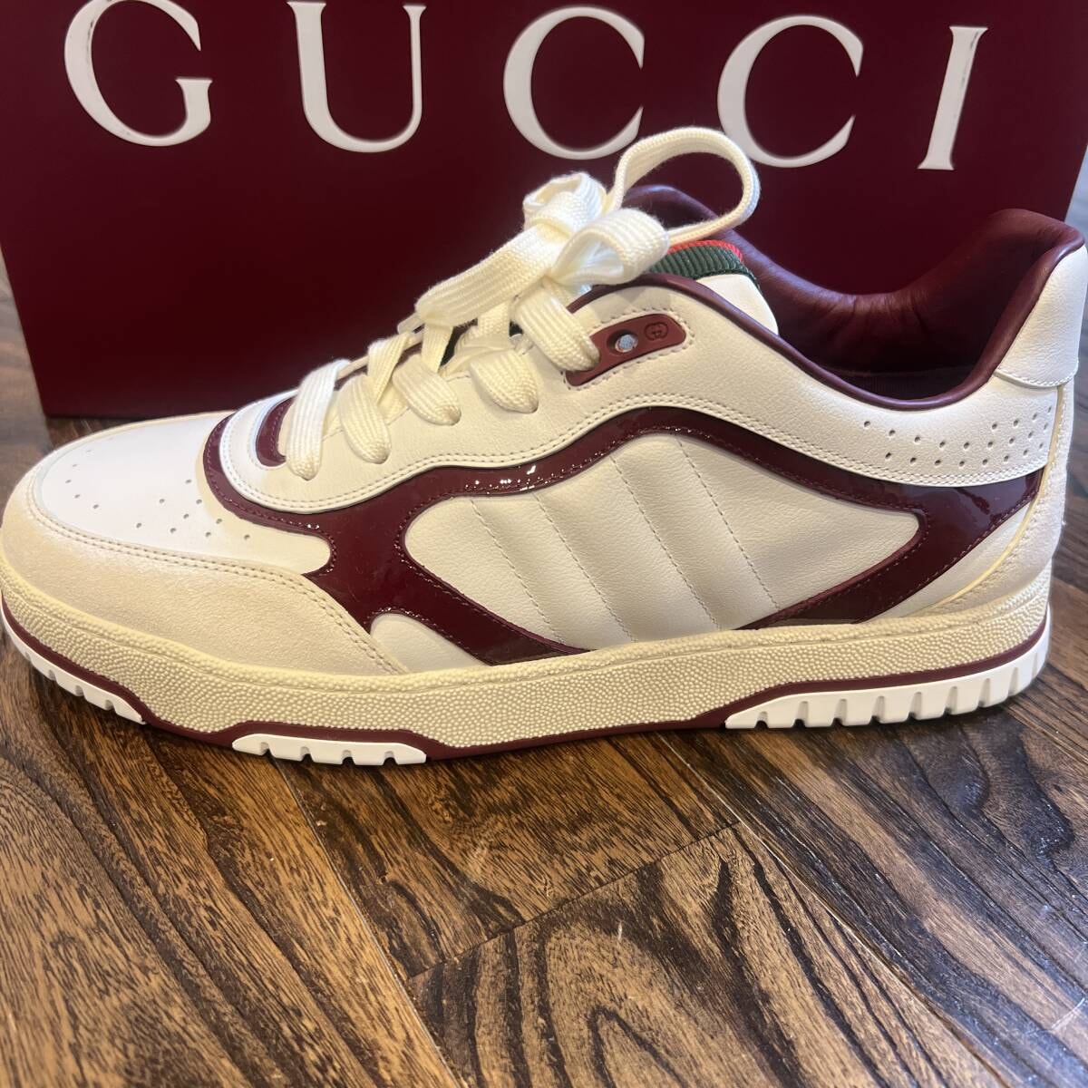 ホワイト × ボルドーの高級感あるカラーリングで、存在感がありながら幅広いコーデに合わせやすい人気モデルです。