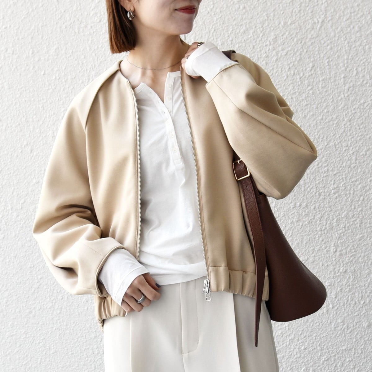 ショルダー部分のタックと、裾のゴムで丸みのあるコクーンシルエットを演出するショートブルゾン。