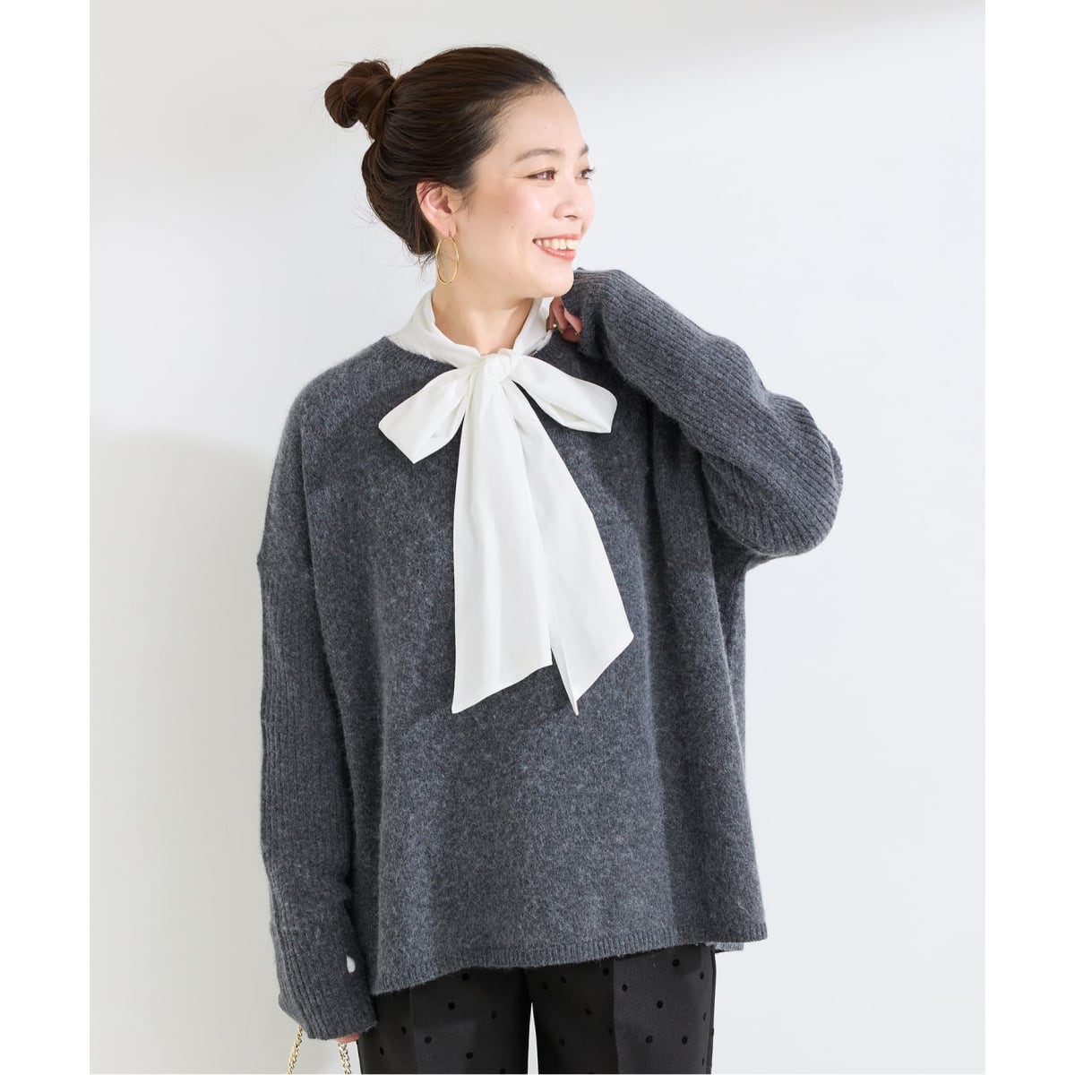 ボウタイは結んで頂くと華やかにボリュームが出ますが、お好みで片結びでシンプルにするのもおすすめです。着やすい素材なので、ボウタイを外しても着回しの効く一着です。