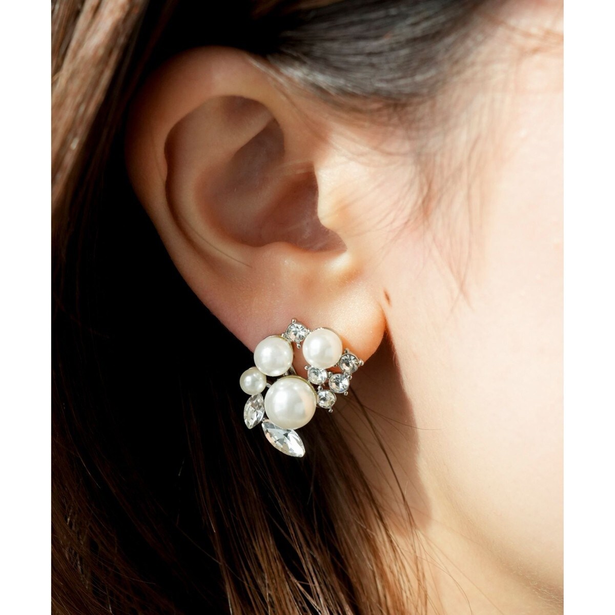 ・華奢なビジューとパール調モチーフを組み合わせた、立体感とボリュームのあるイヤリング・顔まわりを上品かつ華やかに彩るデザイン・結婚式やセレモニースタイルなど、特別なシーンにぴったりのアイテム