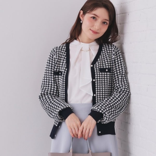 ・パール調のボタンが、さりげない華やかさを添え、上品さを引き立てています。