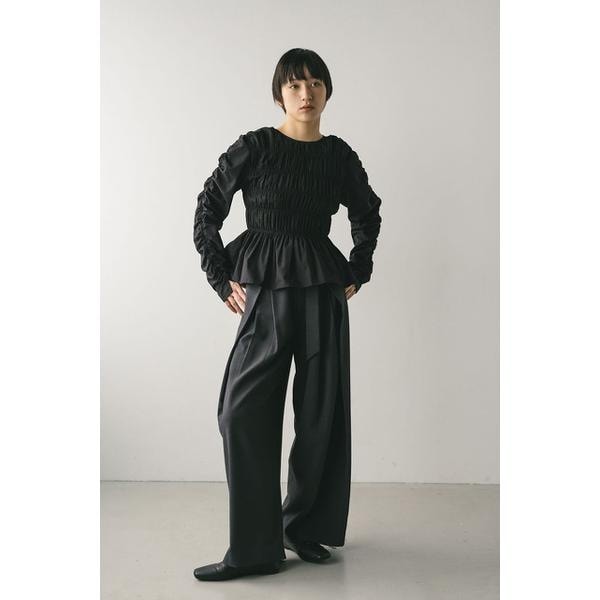 BLK:モデル身長168cm(FREEサイズ着用)WHT,KHA:モデル身長172cm(FREEサイズ着用)全体にシャーリングを施し、フィット感と華やかな表情を両立したブラウス。裾はペプラム仕様になっており、自然な広がりがスタイルに女性らしいメリハリをプラスします。袖にはギャザーを入れて立体感を出し、動きに合わせて柔らかな陰影を演出。デイリーからお出かけまで活躍する、存在感のある一枚です。パンツに合わせてすっきりと、スカートに合わせてフェミニンにと、幅広いスタイリングを楽しめます。ストレッチあり(シャーリング部分)、透け感なし。【お手入れ方法】マシンウォッシュ可