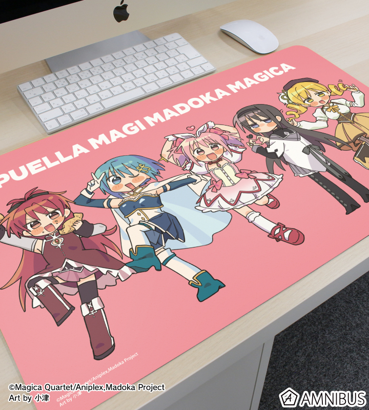 小津さん描き起こしちびキャライラストの鹿目まどか、暁美ほむら、巴マミ、美樹さやか、佐倉杏子をメインにデザインし、マルチデスクマットに仕上げました。