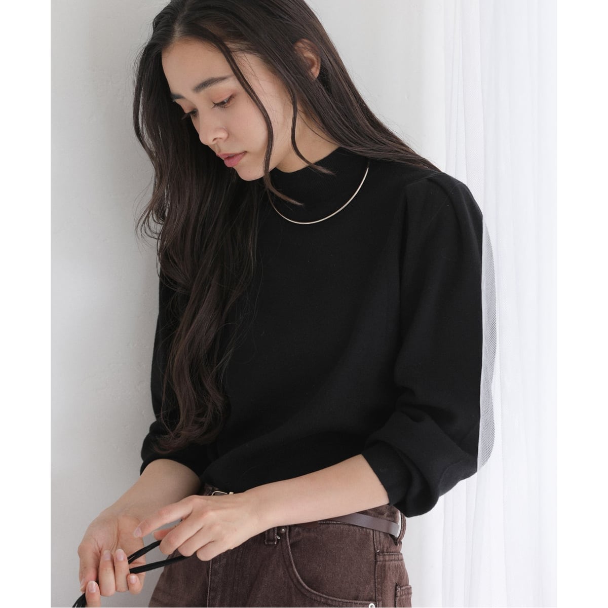 程よい立ち上がりのハイネックは、首元のラインをスッキリ見せて上品な印象に。