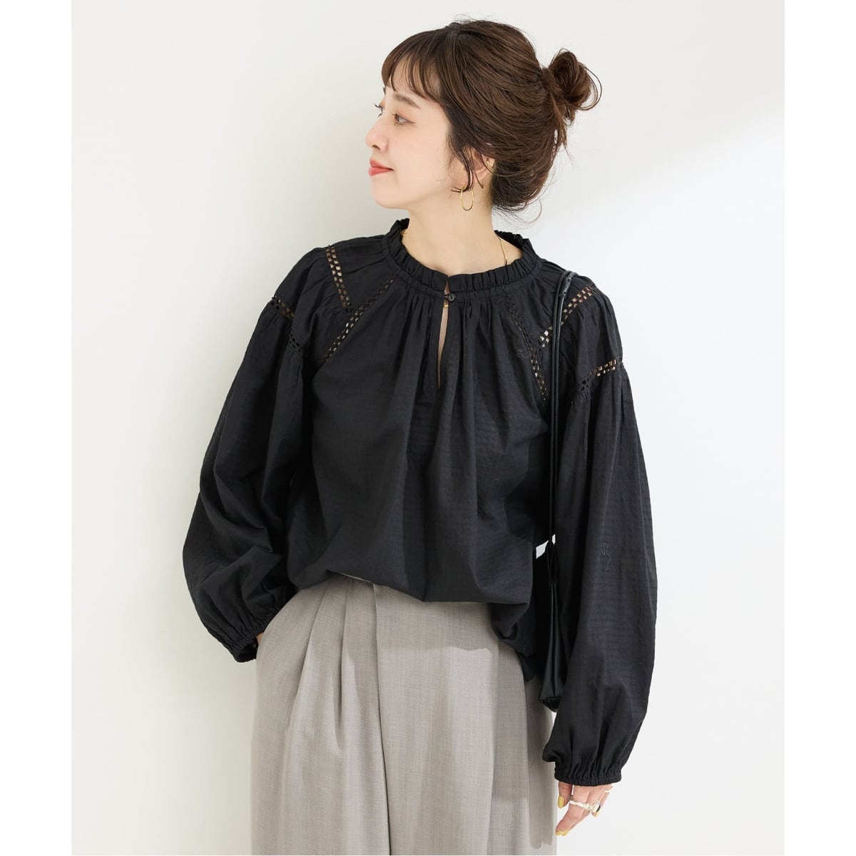 程よくハリのある素材と、袖の切替え部分のハシゴレースのデザインが効いたブラウスです。秋らしいブラックとブラウンの2カラーでお作りし、こっくりとした色味で大人っぽく着ていただけます。オーセンティックなボトムスとも相性が良く、スタイリングの幅が広がるアイテムです。手洗い可能でご自宅でのイージーケアができるのも嬉しいポイントです!