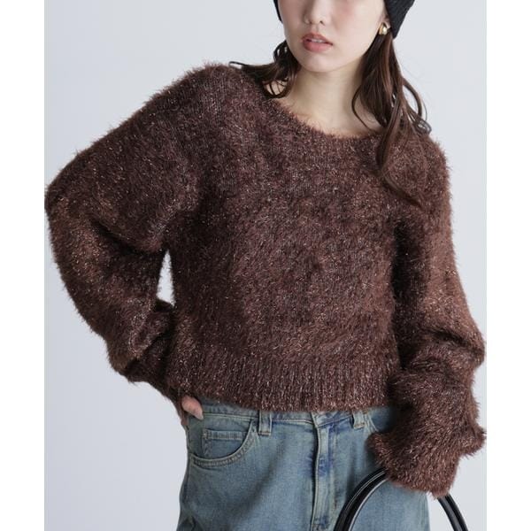 昨シーズンご好評いただいたニットが、新色ブラウンを加えて再登場!フェザー糸とラメのフェザー糸を引きそろえたショート丈ニットです。ニット自体はボリュームがありますが、ショート丈で身幅はゆったりとした着やすいサイズ感です。肌ざわりもやわらかくストレスフリーな着心地です。デニムを合わせるとカジュアルで可愛いスタイルに。スラックス、ショートボトムスと合わせると、キレイめフェミニンな雰囲気にも着回せます。※モデルの着用画像の場合、光の当たり具合により、実際の色味と異なって見えることがございます。色味は、商品単体の画像をご参照ください。