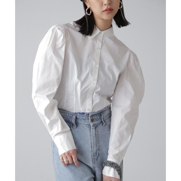 コットンタイプライターを使用したウエストシェイプシャツ。肩を強調するパフスリーブで、逆三角形のようなフォルムが特徴です。ウエストをシェイプすることでボトムにINしやすくなっています。おすすめの着こなしは、ビスチェを合わせてシャツの裾を出しボトムと合わせると旬なレイヤードが完成します。※モデルの着用画像の場合、光の当たり具合により、実際の色味と異なって見えることがございます。色味は、商品単体の画像をご参照ください。