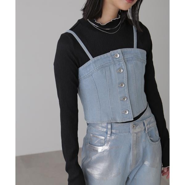 デニムジャケットをリメイクしたような切り替えを入れた、トレンドライクなビスチェ。コルセット風に体にフィットしやすい作りと、後ろはゴムシャーリングで着用感も良いです。肩のストラップは長さ調節でき、ボタンで取り外しも可能。中にシャツや薄手のニット、Tシャツとレイヤードすれば、オールシーズン楽しめます。また、アシメベルトストレートデニムパンツ(店舗商品番号/1314130009)と、パネルエッグワイドデニムパンツ(1314130008)とのセットアップで、オールインワン風コーディネートもおすすめです。※モデルの着用画像の場合、光の当たり具合により、実際の色味と異なって見えることがございます。色味は、商品単体の画像をご参照ください。