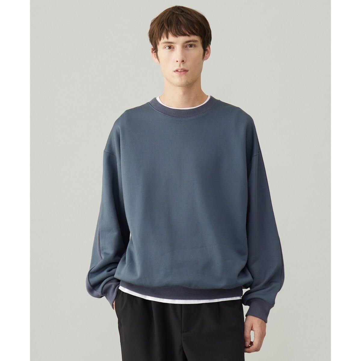 ■デザインUSトレーニングスウェットをベースに仕上げた、クルーネックスウェット。着丈に対して身幅がゆったりしているのでシルエットが特徴的。また袖回りがゆったりしているので着用感はストレスフリーです。素材がしっかりしているのでボディラインを拾わないのもポイントです。