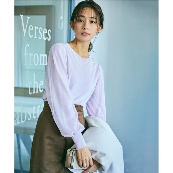 2021AW エアリーなチュール袖がポイントのニットプルオーバー ■デザイン チュールを重ねた袖がエアリーに印象付けてくれるニットプルオーバー。前後逆に着用して頂くと、Vネックカーディガンとしても着て頂ける2WAY仕様が嬉しい1着です。袖は透けない仕様にしているので、冬時期でも安心して着て頂けます。さらっとした素材感の為、暖房の効いた場所でも快適に過ごすことが出来ます。優しい印象のブルー(#070)、女性らしいライラック(#082)、キレイ目にも使えるブラック(#005)の3色展開です。 ■素材 さらっとした風合いが特徴のレーヨン、ナイロン糸を使用。肌離れが良く、蒸れにくいので暖房の効いた場所や厚手のアウターを着ても快適に着て頂けます。袖には柔らかなトリコット編みのチュールを重ねて、立体感を出しています。 ※商品画像はサンプルを使用しているため、実際にお届けする商品と色味やサイズ等の仕様に変更がある場合がございます。予めご了承ください。
