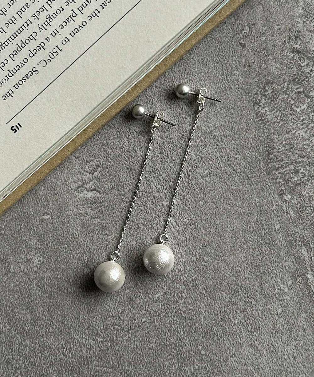 華奢なチェーンの先でコットンパールがふんわり揺れる、上品で女性らしいロングピアス。