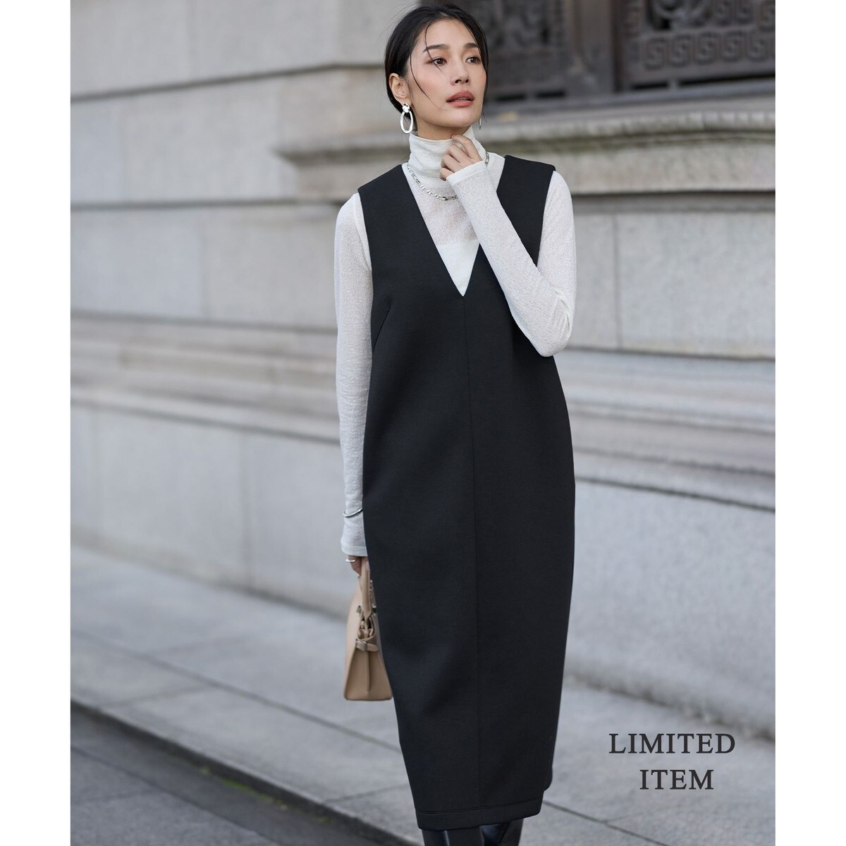 ■デザインフロントの深Vネックがシャープで洗練された印象のジャンパースカートです。バックファスナー付きで脱ぎ着もしやすく、後ろの裾にセンターベントを配し、動きやすいのも嬉しいポイントです。裏なしで軽い中肉素材で、春以降も長い期間使える汎用性の高い1枚です。インナー次第でカジュアルにもきれい目にも変化が可能なので、シーンレスに活躍します。