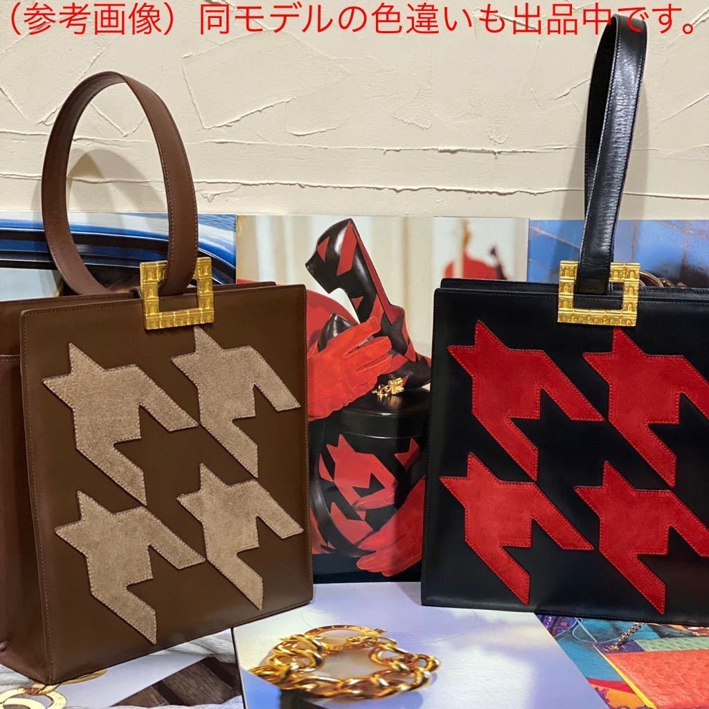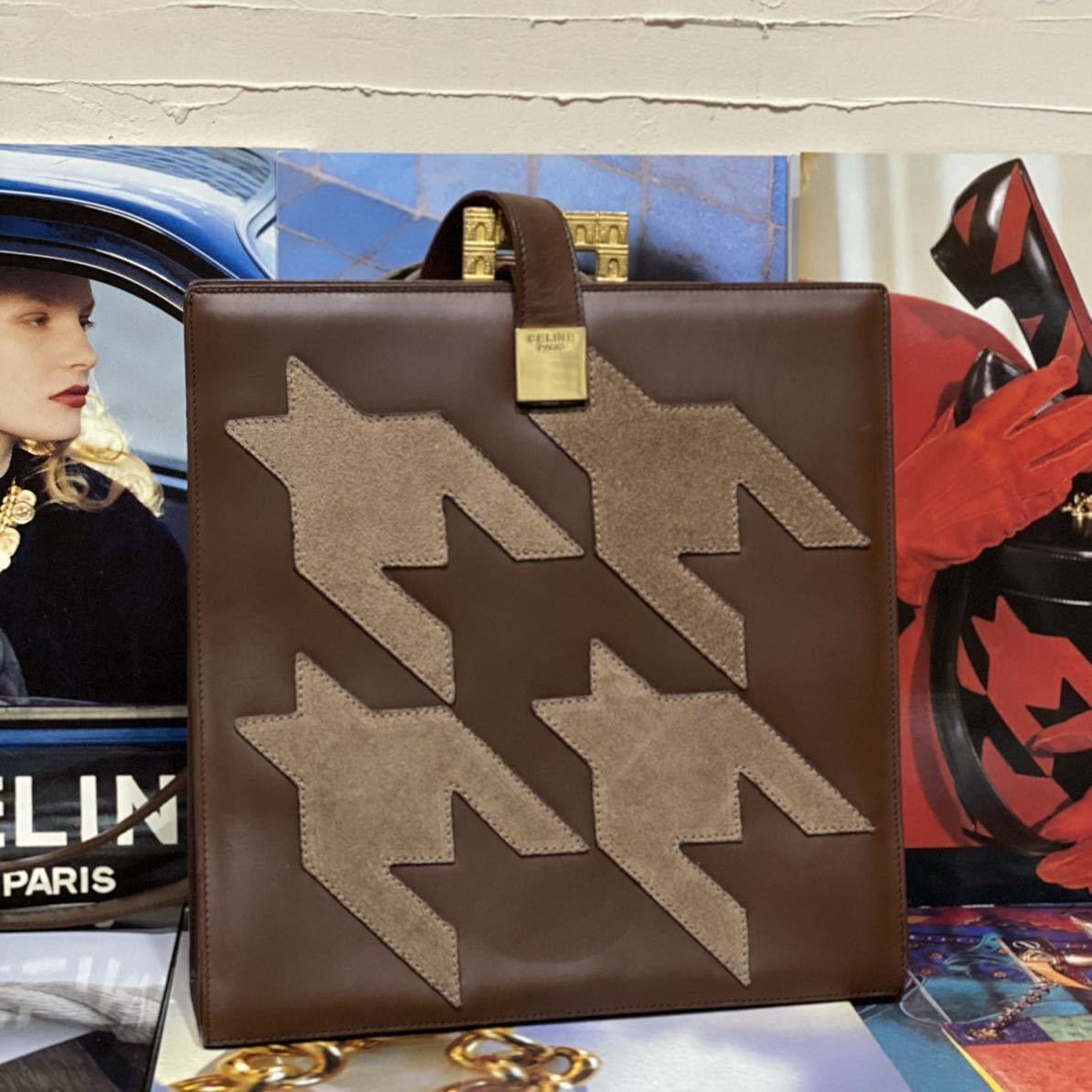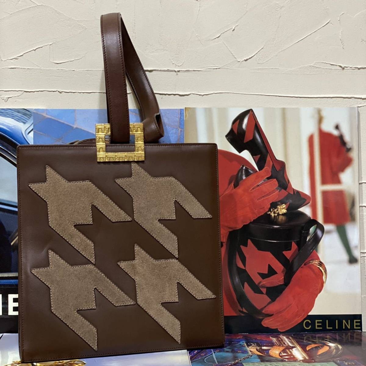 珍しい千鳥格子柄に象られたスエードレザーが正面と背面にステッチされ、ゴージャスなゴールドの凱旋門金具が装飾されたヴィンテージセリーヌらしいラグジュアリーかつ個性溢れるアイテムです。
