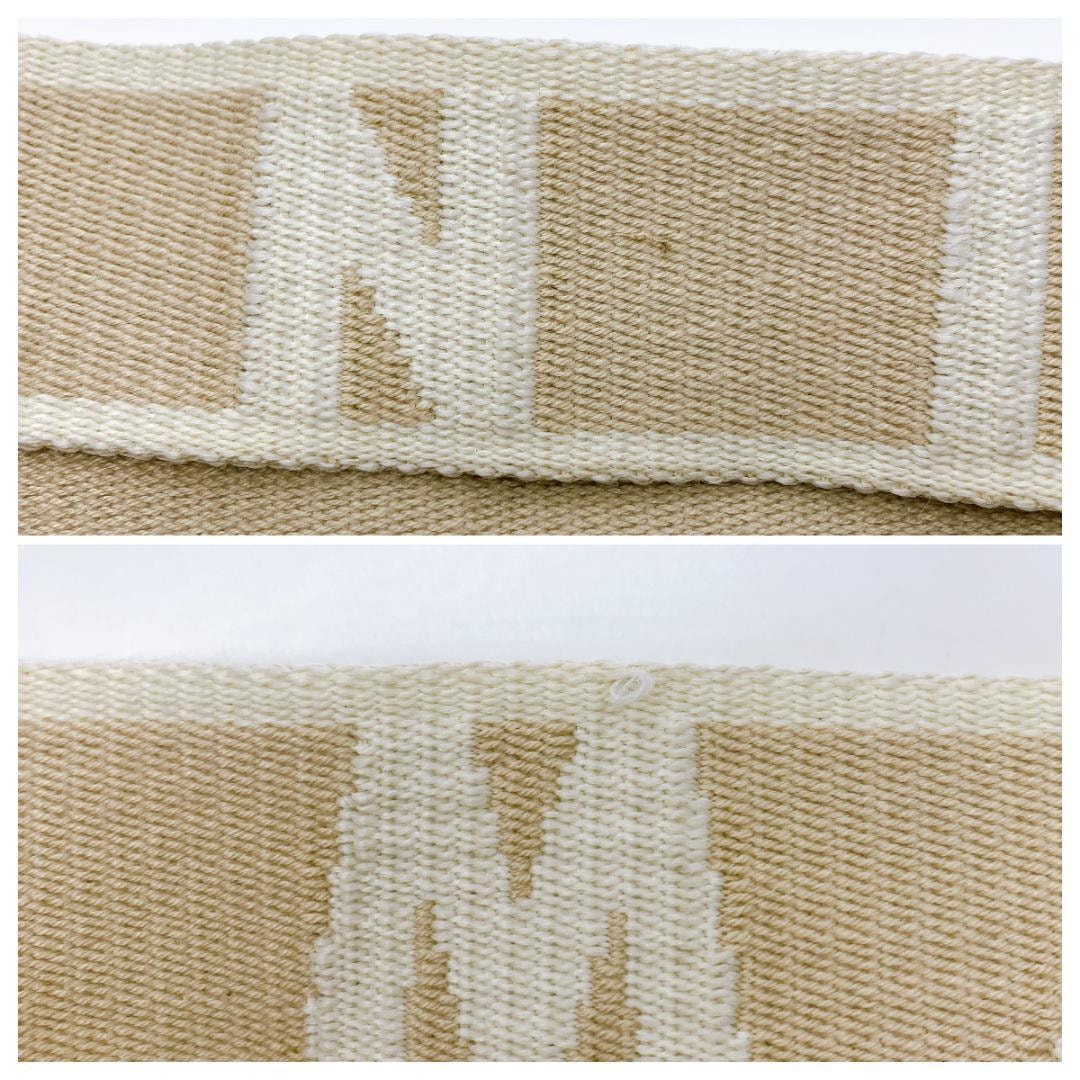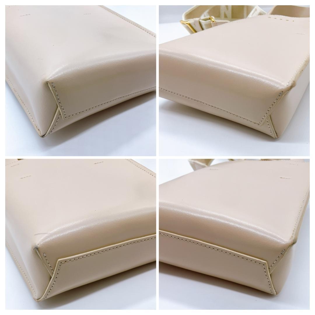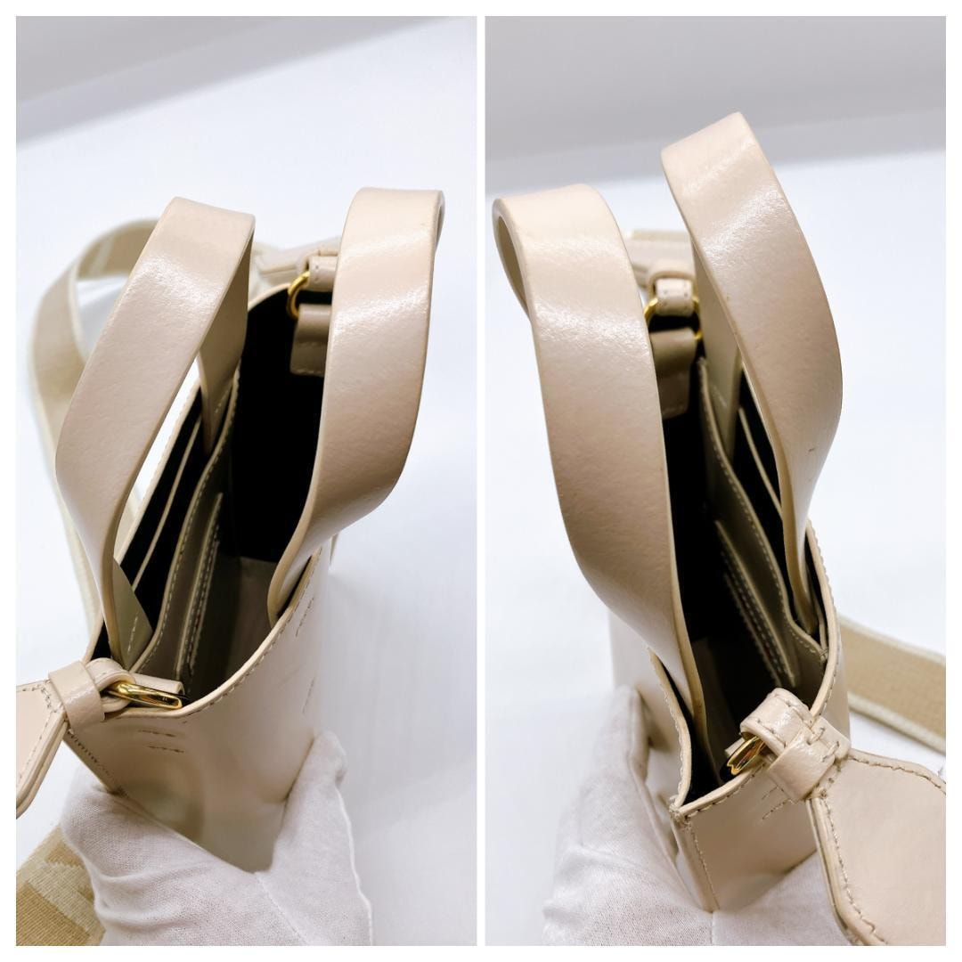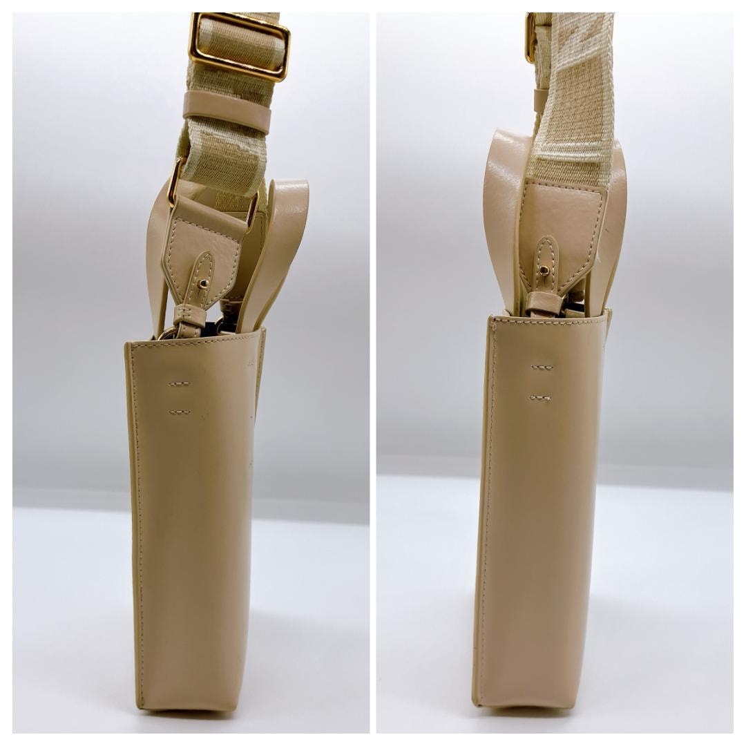 ベージュのレザー製ショルダーバッグ、調整可能なストラップ付き。