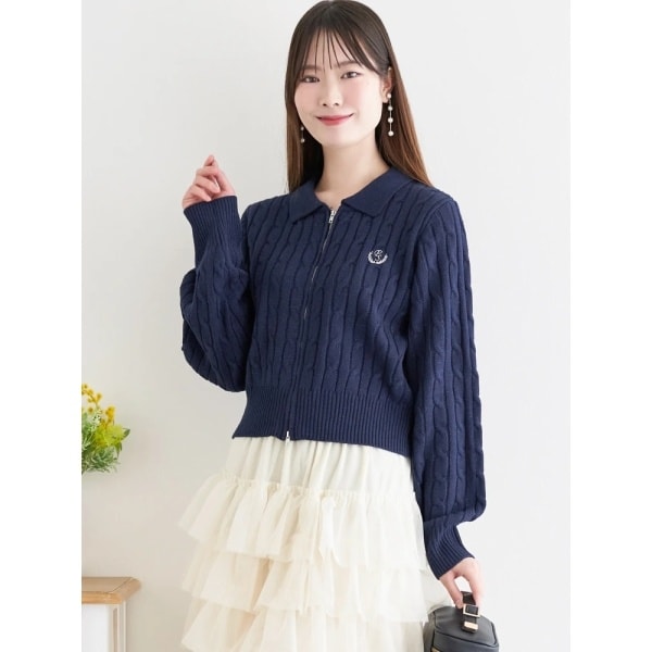 立体感のあるケーブル編みが目を引く、上品な印象の衿付きニット。