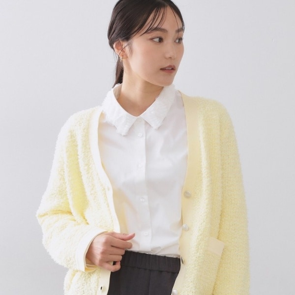 ・襟にチュールを縫い付けた他にはないデザインで、顔周りにさりげなく華やぎをプラス。